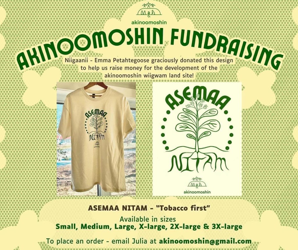 Niigaanii Emma Petahtegoose graciously donated this ASEMAA NITAM design to help us raise money for the development of the akinoomoshin wigwam land site. For more information or to place an order, e-mail Julia at akinoomoshin@gmail.com